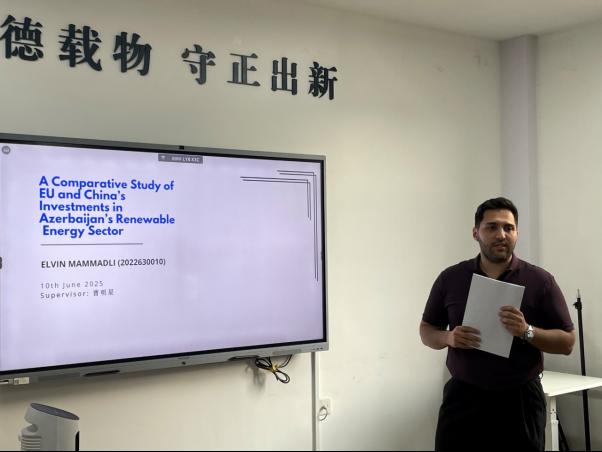 The Institute of Finance and Economics Research at the Central University of Finance and Economics (CUFE) successfully hosted a workshop titled "Comparative Study of EU and China’s Investments in Azerbaijan’s Renewable Energy Sector" on June 11, 2025. The event, held in Room 314 of the Tupei Building, featured a compelling presentation by Elvin Mammadli, who shared the latest findings from their research.