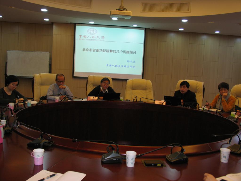 孙久文教授首先从北京城市功能、北京产业结构演变特点等方面对北京非首都功能疏解的背景进行了分析,提出首都面临“大城市病”、人口过度集中等问题,从而进一步提出北京非首都功能疏解面临的两大任务,即“治病”与“协同”,实施路径是治理北京人口与产业空间布局不协调、城市单中心无序蔓延、区域差异不断扩大和交通、大气污染等问题,实现产业、交通、环境之间的协调发展。在此基础上,孙久文教授从理论和实证的角度对北京城市功能进行了梳理,并进行了北京城市定位,从而提出了北京非首都功能疏解的两大总体思路,即优化城市功能和调整功能布局。最后,孙久文教授对通州北京城市副中心建设问题进行了探讨,提出通州的总体定位应是打造交通便捷、功能完备、职住合一的现代化国际新城。但同时应注意避免新的“大城市病”、协调新城与老城关系、节约行政成本和修改北京市交通规划等问题。报告结束后,与会老师就北京非首都功能疏解相关问题进行了提问,孙久文教授作出了详细的解答。