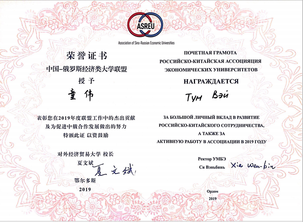 大会对童伟研究员在中俄经济类大学联盟工作中的杰出贡献及为促进中俄合作发展做出的努力给予高度评价,并颁发杰出贡献荣誉证书。