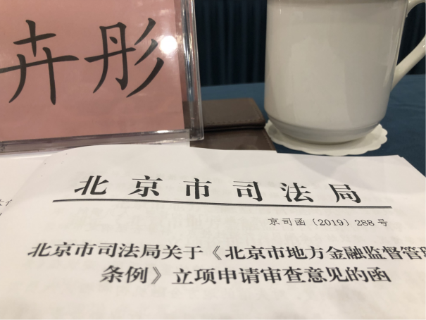 2019年11月14日上午在北京金龙建国温泉酒店一层牡丹厅召开《北京市地方金融监督管理条例》立法论证会。全国人大财经委员会法案室主任龚繁荣,市人大财经委员会主任委员、财经办公室主任张伯旭,市人大财经委员会副主任委员、财经办公室路海滨,北京市金融监管局副局长李妍、北京市金融监管局法制处处长潘琍、北京市司法局立法二处副处长范红娟等参加此次立法论证会。