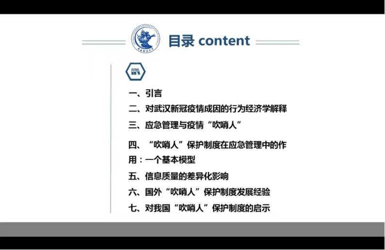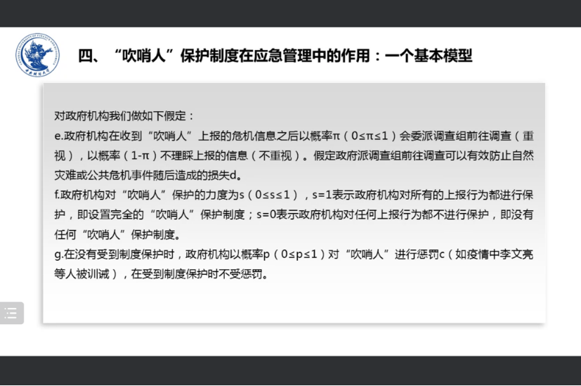 此次讲座中,昌忠泽教授首先结合后悔最小化与偏差、过度自信、羊群行为和过分外推倾向等行为经济学概念对武汉新冠疫情的成因问题进行分析。其后,昌教授介绍了应急管理中的“吹哨”行为和“吹哨人”保护制度,并指出“吹哨”行为作为一种自下而上的危机预警往往更加及时有效,而“吹哨人”保护制度正是为“吹哨”行为提供了制度保障。接着,昌教授通过基本模型阐述“吹哨人”保护制度在应急管理中的作用。根据推导结果,当政府机构设置的“吹哨人”保护制度覆盖越全面、对上报的信息重视程度越高时,内部知情人士选择上报信息的预期收益和净收益越高,越有动力成为“吹哨人”;相反,政府的惩罚使得内部知情人士缺乏上报信息的动力,从理论上说明 “吹哨人”保护制度在应对公共危机时的合理性。昌忠泽教授还进一步讨论了信息质量的差异化对吹哨人保护制度的影响,并根据结论指出,建立“吹哨人”奖励制度能够实现“吹哨人”个人利益与应急管理目标的激励相容。同时,昌教授介绍了美国、英国和日本等国家“吹哨人”保护制度的发展经验,并对比分析中国应急管理体系的优点和问题。
