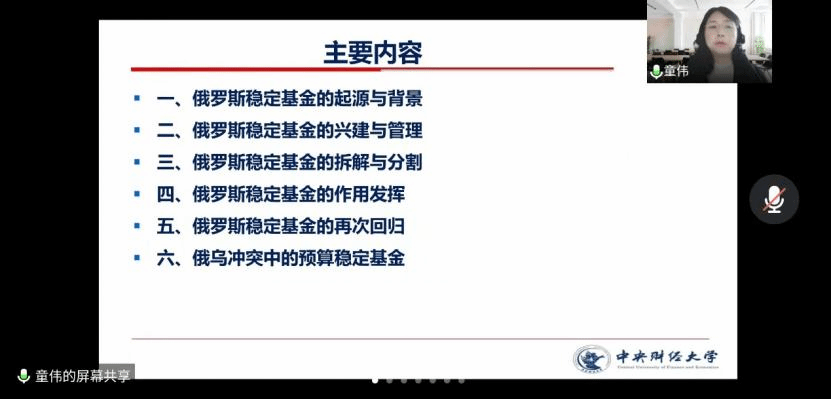 2022年10月12日下午,pc28预测在线预测神测网咪牌龙马奋进“财经·格致”名师系列论坛第十六讲在腾讯会议线上成功举办。本次论坛的主讲人为童伟研究员,报告主题为“俄罗斯建立预算稳定基金制度的实践与启示”。论坛由pc28预测在线预测神测网咪牌曹明星副院长主持,pc28预测在线预测神测网咪牌五十余名师生参加了此次论坛。
