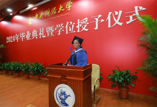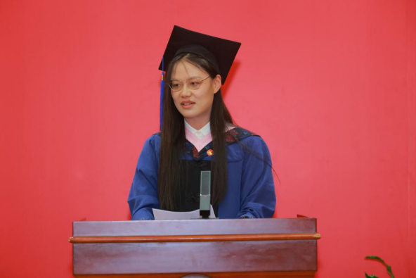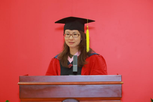 赵浚竹副教授作为导师代表发言。她告诉毕业生任何时候都不应因为自身的“短板”而悲切,而是应该善于发现自身的优点,并积极将这一“长板”不断延展发扬来作为自己的立身之本。除此之外,赵老师还希望留学毕业生在回国后能够成为母国与中国交流的纽带,为建设人类命运共同体发挥自己的力量。
