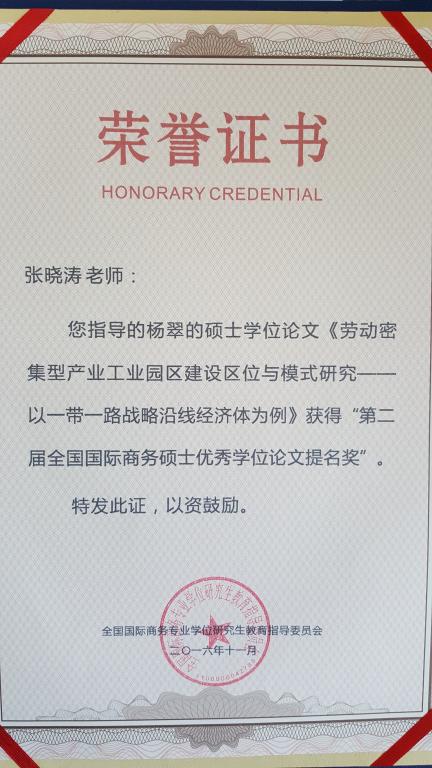 我院院长张晓涛教授指导的硕士研究生获得第二届全国国际商务硕士优秀学位论文提名奖 |
