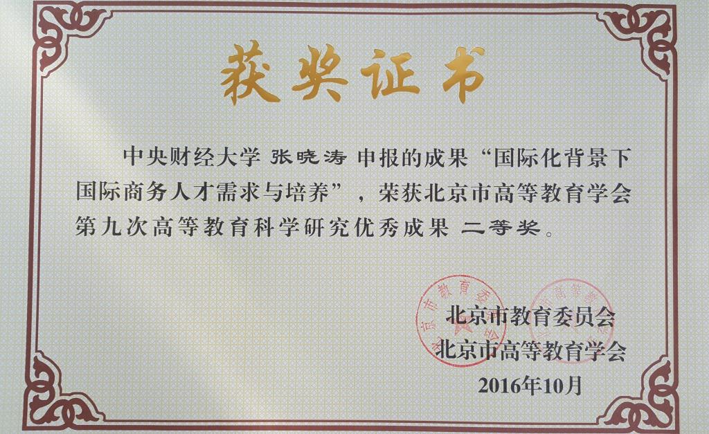 2016年12月30日,北京市高等教育学会召开第十次会员代表大会,大会对北京市高等教育学会第九次高等教育科学研究成果进行了奖励,我院院长、北京财经研究基地专家张晓涛教授申报的成果“国际化背景下国际商务人才需求与培养”荣获北京市高等教育学会第九次高等教育科学研究优秀成果二等奖。