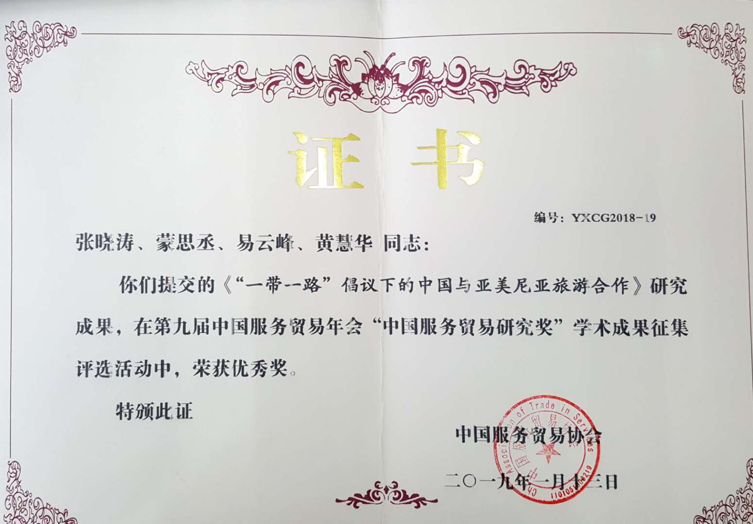 张晓涛教授及其合作者(蒙思丞、易云锋、黄慧华)的论文《“一带一路”倡议下的中国与亚美尼亚旅游合作》获得第九届中国服务贸易年会“中国服务贸易研究奖”优秀成果奖。该成果是张晓涛教授团队在“一带一路”经贸与投资合作领域的系列成果之一。