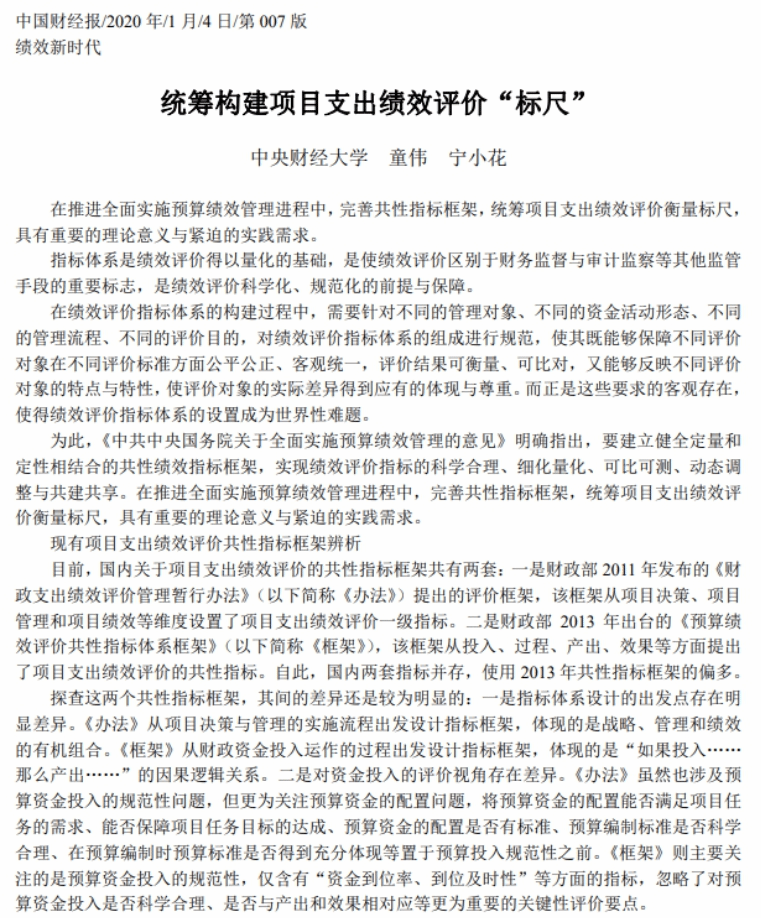 2020年1月4日,我院俄罗斯东欧中亚研究中心主任、中央财经大学绩效管理研究中心主任童伟研究员,在《中国财经报》“绩效新时代”版,发表文章《统筹构建项目支出绩效评价“标尺”》。文章指出:在推进全面实施预算绩效管理进程中,完善共性指标框架,统筹项目支出绩效评价衡量标尺,具有重要的理论意义与紧迫的实践需求。