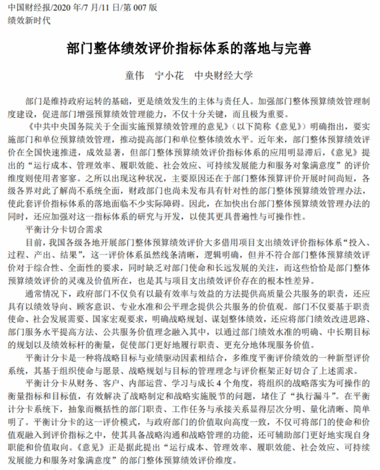 2020年7月11日,我院俄罗斯东欧中亚研究中心主任、中央财经大学绩效管理研究中心主任童伟研究员,在《中国财经报》“绩效新时代”版,发表文章《部门整体绩效评价指标体系的落地与完善》。文章指出了加强部门整体预算绩效管理制度建设,促进部门增强预算绩效管理能力,不仅十分关键,而且极为重要。