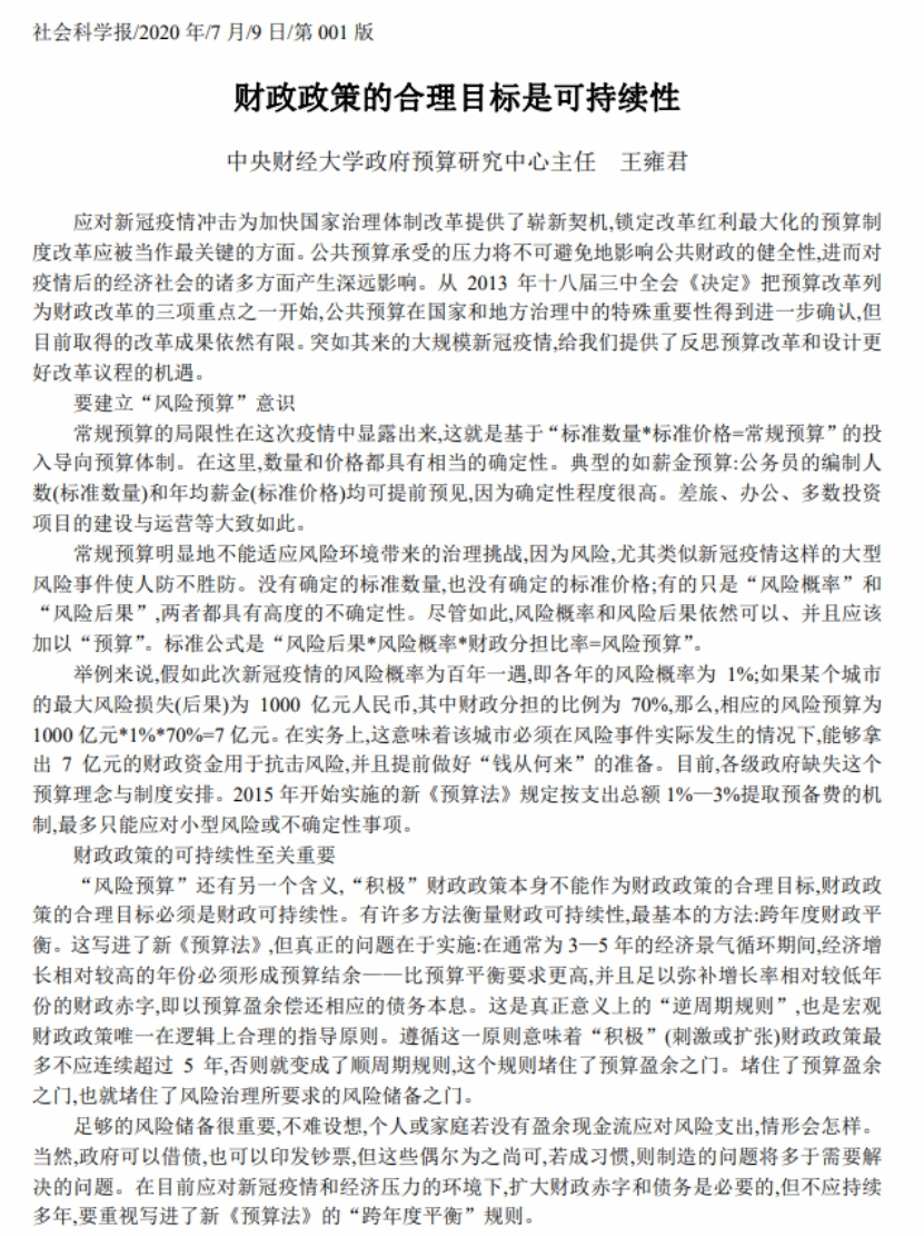 2020年7月9日,我院政府预算研究中心主任王雍君教授,在《社会科学报》,发表文章《财政政策的合理目标是可持续性》。文章指出:应对新冠疫情冲击为加快国家治理体制改革提供了崭新契机,锁定改革红利最大化的预算制度改革应被当作最关键的方面。公共预算承受的压力将不可避免地影响公共财政的健全性,进而对疫情后的经济社会的诸多方面产生深远影响。