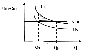 图1中,纵轴表示边际效用/边际成本,横轴表示供求数量;Up为个体的边际效用曲线,Us为社会边际效用曲线;社会最优均衡数量为Es,低于个体最优均衡数量Qp的差值为QsQp,相应的社会福利净损失为阴影三角形面积,反映稀缺资源错配的代价,即劣效品超出社会最优水平招致的经济效率代价。