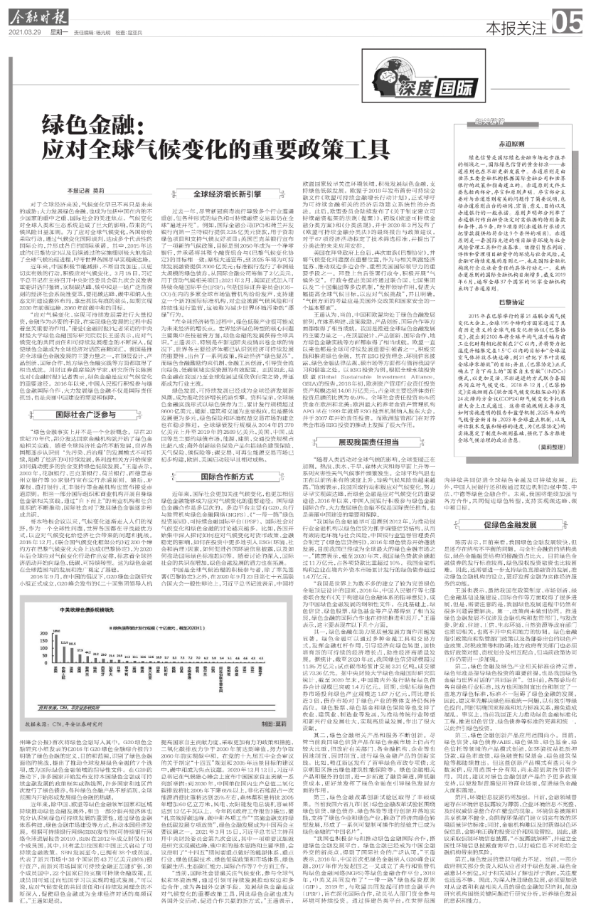 3月29日,《金融时报》整版刊发《绿色金融:应对全球气候变化的重要政策工具》深度文章,我院王遥研究员接受《金融时报》记者专访,并就绿色金融国际发展情况、绿色金融国际合作及绿色金融支持绿色复苏等发表了观点。