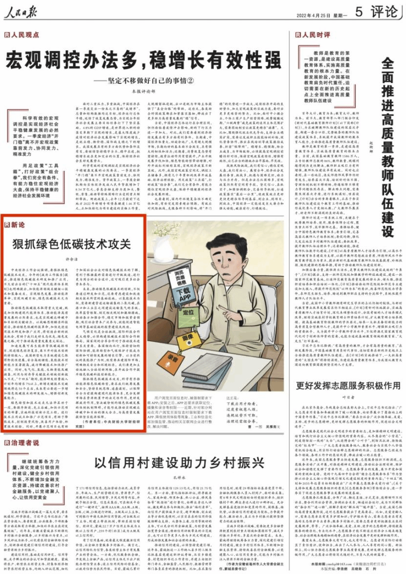 2022年4月25日,我院中央财经大学-北京银行 双碳与金融研究中心常务副主任许余洁在《人民日报》发表“狠抓绿色低碳技术攻关”一文。