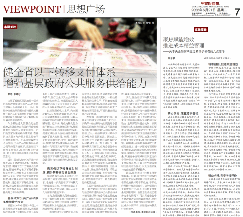2022年6月21日,我院俄罗斯东欧中亚研究中心主任、中央财经大学绩效管理研究中心主任童伟研究员,与合作者在《中国财经报》第七版,发表文章《健全省以下转移支付体系增强基层政府公共服务供给能力》。