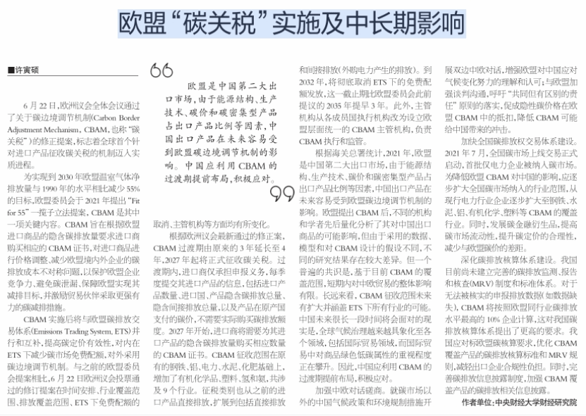 我院许寅硕副研究员在2022年8月5日的《中国城乡金融报》上发表文章“欧盟‘碳关税’实施及中长期影响”。