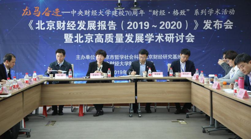 2019年10月16日上午,龙马奋进·校庆70周年系列学术活动《北京财经发展报告(2019~2020)》发布会暨北京高质量发展学术研讨会在中央财经大学学术会堂706会议室成功举办。本次会议由北京市哲学社会科学北京财经研究基地和pc28预测在线预测神测网咪牌主办。北京市社会科学界联合会副主席李翠玲、北京市哲学社会科学规划办智库工作部副主任刘军、与来自国家发改委产业经济与技术经济研究所、北京市发改委协同政策规划处、北京大学首都发展研究院、北京大学经济学院、中国人民大学财政金融学院、中国社会科学院工业经济研究所、北京环境交易所、中国社会科学文献出版社等多位学术界和实务界的特邀嘉宾,以及中央财经大学师生等50余人参与了本次会议。