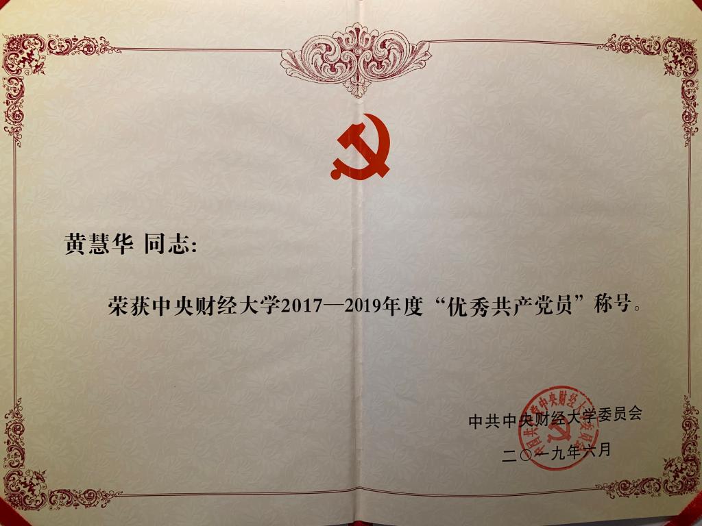 2019年6月26日下午,中央财经大学庆祝中国共产党成立98周年暨表彰大会在学术会堂206报告厅举行。大会由校党委副书记梁勇主持,学校党委委员、纪委委员、全体中层干部、二级党组织书记与委员、各党支部书记与委员、师生党员代表等参加了本次大会。我院学生党支部黄慧华同学荣获中央财经大学2017至2019年度“优秀共产党员”荣誉称号。