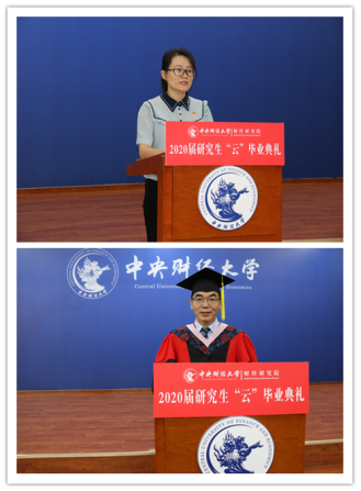 中央财经大学校长助理李涛教授向2020届全体毕业生寄语,他代表学校对圆满完成学业的毕业生们表示衷心的祝贺,对教导和陪伴毕业生们成长的老师们致以衷心的感谢,向一直以来支持和激励毕业生们的家人致以诚挚的敬意。当今世界正经历百年未有之大变局,他勉励毕业生们要敢于正视改变,做“处变不惊、临事不惧”的勇者;要积极应对改变,做“变通趋时、与时俱进”的智者;要努力创造改变,做“不负韶华、向前向上”的强者。他相信作为“后浪”的2020届毕业生们,可以迎接和面对各种挑战和困难,在风雨中锤炼意志,在创造中拥抱未来,努力打造一个更加“硬核”的自我,让世界因你而改变。
