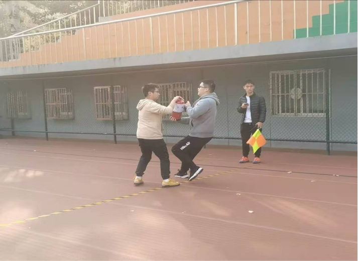 除此之外,我院国防经济研究生唐岱和国防经济研究生朱敬轩两位同学在比赛中默契配合,迅速完成了灭火器交接环节,为后续的比赛争取了时间。周围观赛的同学们也被现场活跃的气氛感染,不由自主地为场上选手呐喊加油。