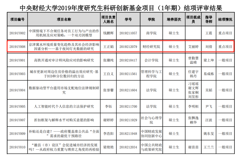 2021年4月30日,中央财经大学2019年度研究生科研创新基金项目结项评审结果公布,我院王正娟同学主持的《京津冀水环境质量变化趋势及其社会经济影响因素分析—基于夜间灯光数据的研究》课题,获得重点项目结项。