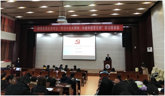 培训会一开始,研究生工作部徐淼老师对党的十九大报告的重要思想进行回顾,并对研究生党支部书记和支委们提出全面深入学习宣传贯彻党的十九大精神的要求。徐老师提到,研究生党支部、班团组织要原原本本、原汁原味学习好党的十九大精神,也要学出研究生的特色,要在学习中研究,要在实践中创新;研究生党支部书记和支委们更要在学习中起到表率作用,要深入研究生群体里带头学习传承,要带进班集体里化为自觉行动。徐老师还表达了对在座的研究生党员干部的殷切期望,希望研究生党员干部通过多种学习方式更好地理解习近平新时代中国特色社会主义思想,做一名坚定的青年马克思主义者,发扬引领示范的模范带头作用,志存高远,脚踏实地,努力成为我国伟大事业的参与者,建设者和贡献者。