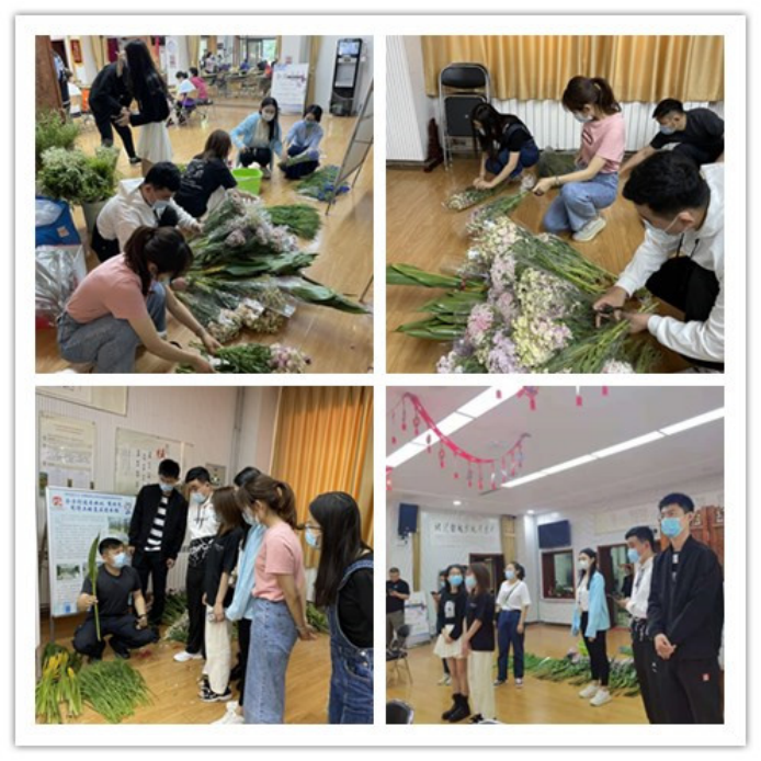活动的第二部分是“以花献礼,喜迎建党100周年”大有庄社区插花活动。插花培训师讲述了插花的历史跟文化,并结合实践,组织社区居民动手制作花篮。在活动中,我院研究生们作为志愿者,化身小助手,帮助分发各类花束和花篮等。