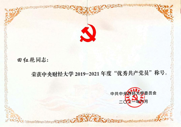 我院2020级区域经济研究生田红艳荣获“中央财经大学 2019-2021年度优秀共产党员”荣誉称号