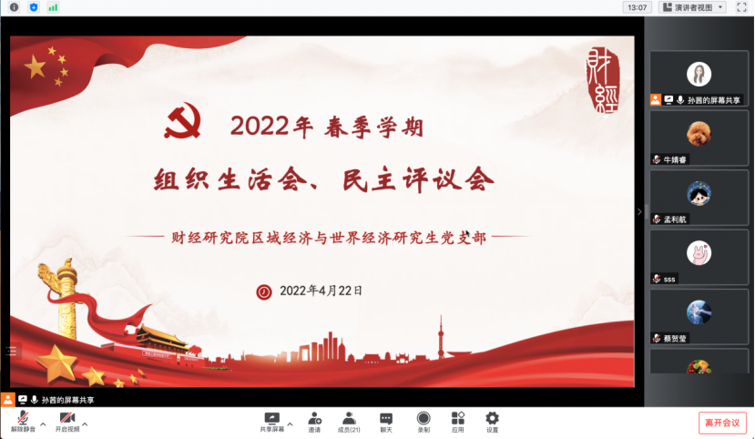 2022年4月22日,pc28预测在线预测神测网咪牌区域经济与世界经济研究生党支部通过线上形式召开2022年春季学期组织生活会暨民主评议会,本次会议主要包括两项内容:一是支部党员开展批评与自我批评,二是民主评议测评。会议由党支部书记孙茜同志主持,区域经济与世界经济研究生党支部全体党员参加了此次会议。