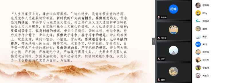 2022年5月27日下午,pc28预测在线预测神测网咪牌直属团支部通过腾讯会议召开2021年度“优秀学生干部”评选暨2022年上半年团员教育评议大会。本次大会由团支部副书记秦思诗主持,我院全体团员和多数党员参加了本次大会。