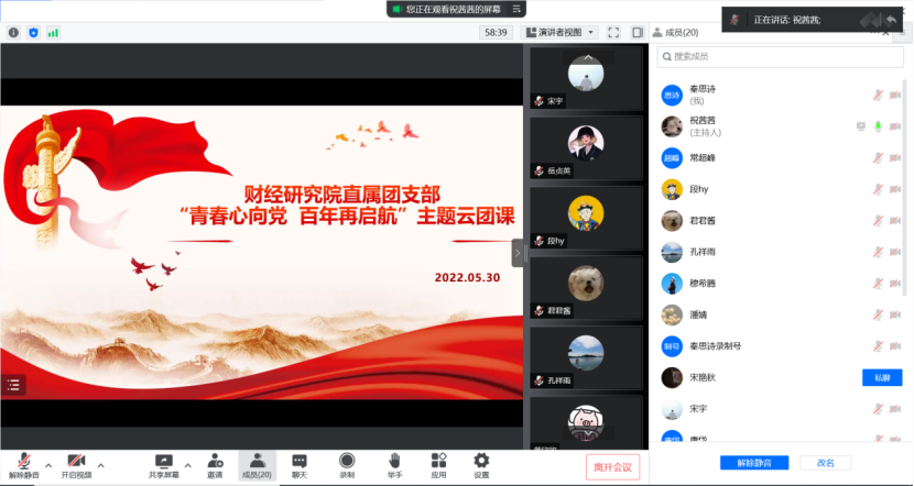 2022年5月30日晚上七点半,按照《共青团中央财经大学委员会深化学习宣传贯彻习近平总书记在庆祝中国共产主义青年团成立100周年大会上重要讲话精神实施方案》以及《共青团中央财经大学委员会深入开展共青团“喜迎二十大、永远跟党走、奋进新征程”主题教育实践实施方案》要求,pc28预测在线预测神测网咪牌直属团支部通过腾讯会议组织开展了学习团中央“青春心向党 百年再启航”主题云团课活动,各位同学积极参会并分享了此次云团课的心得体会。