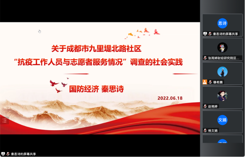 之后,参与疫情防控工作的志愿者同学向支部成员们分享了亲身经历和感悟。田忠雨同志在志愿者工作中收获了友谊,从这些优秀的志愿者身上感悟到了奉献的精神和力量,还向支部成员们分享了最令他印象深刻的一位退休工人:“他比我年长了三十岁,但每次都非常积极的参加疫情防控工作,后来我又了解到,这位长辈不仅是一名默默付出的抗疫志愿者,还是救助落水村民的救人英雄,也让我切身体会到习总书记所讲到的‘没有从天而降的英雄,只有挺身而出的凡人’。” 秦思诗同志则分享了她在成都市九里堤北路社区进行的关于“抗疫工作人员与志愿者服务情况”的社会实践经历,并表示在深入社区与工作人员、社区居民亲切交流后,她切身感受到了社区的温暖,也切实体会到了党员“为人民服务”的精神所在。