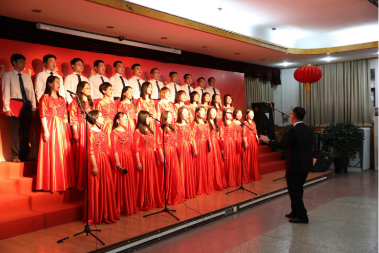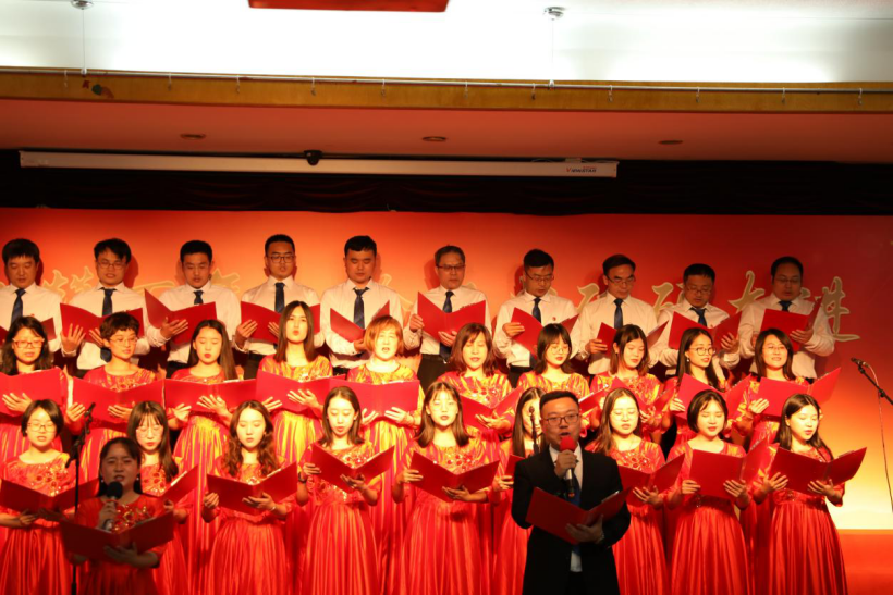 在指挥的手势下,大家铿锵有力地唱起来:“没有共产党就没有新中国,没有共产党就没有新中国,共产党她辛劳为民族,共产党她一心救中国……”