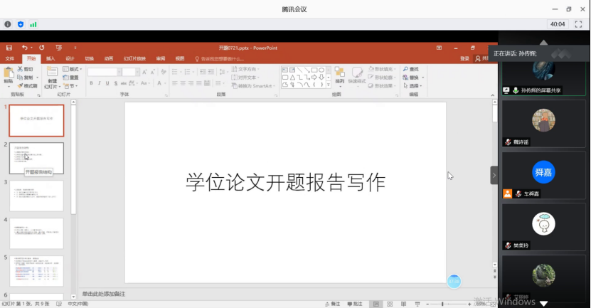 会议第二项议程是邀请研究生班主任孙传辉老师为同学们讲解学位论文开题的注意事项,并对大家在准备开题报告中的疑惑进行解答。孙传辉老师从开题报告的结构、论文选题、研究角度及研究可行性四个方面讲解如何做好论文开题工作,同时孙传辉老师结合普惠金融这一主题为大家讲解如何有效的查找和总结文献,并从多元主体和经济现象属性角度分析如何确定论文研究范围。在讲解结束后,同学们也针对现阶段论文开题过程中遇到的问题向孙老师请教。王正娟同学就论文中大量图表处理问题提出疑问,孙老师建议可以通过总结图表规律、整合图表数据等方法压缩图表数量,多参考期刊文献梳理思路。车舜嘉老师也为大家提出了几点建议,首先文章需聚焦题目,避免文不对题;其次需认真总结文献,注重内在逻辑,拓展研究思路;而且不要夸大论文创新点,有所突破即可;最后应主动与导师沟通交流,积极完善开题报告,抓紧时间,避免仓促。