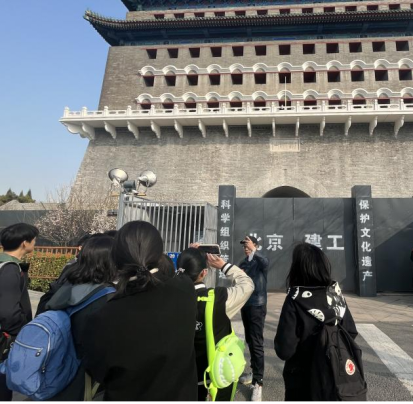 上午9点,我院师生于正阳门箭楼集合。箭楼是北京城中轴线天安门南端的重要建筑之一,郝老师先就箭楼的建筑形式、作用和历史进行了细致的讲解,并为同学们介绍了北京的整体布局和历史变迁。随后,在郝老师的带领下,同学们途径天安门广场,到达故宫博物院。