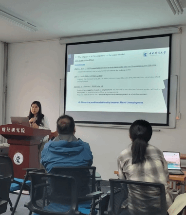 On October 17th 2024, the Institute of Finance and Economic Research (IFER)ofCentral University of Finance and Economics (CUFE) hosted a highly anticipated Student Workshop, providing Master's students with a valuable platform to present their research approaches and progress. The event was well-attended by faculty members and students eager to engage in academic discourse. Two second-year students from the Regional Economics programshowedthe depth and diversity of their research. Rabia Arshad presented her thought-provoking study titled "The Whistleblower's Dilemma: The Battle for Sustainable Reporting Assurance in a Corporate Maze." Priscilla Fayline followed with a comprehensive presentation on the "Impact of AI on the Unemployment of Different Provinces in China," The workshop was further enriched by the presence of three professors—Zhao Guoqin, Zhang Yeqing, and Yan Haosheng—who offered insightful academic feedback. Their constructive comments not only helped the students refine their research objectives and methodologies but also expanded the students' understanding of broader academic debates in their fields. A lively and engaging Q&A session followed the presentations. Fellow students posed a variety of thought-provoking questions, sparking discussions that ranged from methodological approaches to the real-world implications of the presented research. This collaborative environment encouraged further reflection on key themes, such as the role of governance in sustainability and the transformative power of AI on regional economies. Overall, the workshop was a success, providing students with an invaluable opportunity to receive feedback and fostering intellectual growth and academic camaraderie.