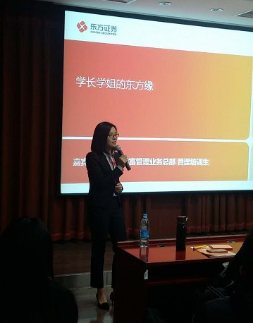 12月1日,北京财经研究基地2015届毕业生张昀晨作为东方证券优秀员工代表,回到母校参加校园招聘宣讲。东方证券是一家A+H股的大型综合性券商,近两年发展迅速,非常注重人才梯队的建设,热诚欢迎优秀的中财学子加入东方证券。在宣讲中,东方证券领导详细介绍了公司发展的历史及前景,对员工的培养机制与优秀的企业文化做了详细阐述。张昀晨作为员工代表回忆了在中财学生时代的美好时光,表达了对母校的感恩,分享了在工作中的所知、所悟,同时希望更多的优秀学子加入东方。