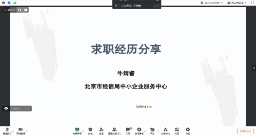 就职于北京市委军民融合发展促进中心的薛婧轩和就职于北京市经济和信息化局中小企业服务中心的牛婧睿重点从公务员考试的笔试准备、面试心态、综合素质方面进行分享,他们建议大家在校期间首先学好专业基础知识,学会将理论联系实践,提高个人分析能力和学习能力。就职于中国民生银行的张雨婷从专业学习、求职规划、兴趣爱好等方面进行分享,希望同学们善待自我、把握当下、学思并行。就职于华为财经的刘雅欣从实习选择、求职方向进行了经验分享,她建议同学们针对未来求职岗位进行技能训练,提升自己的专业能力。她鼓励同学们在未来求职过程中要有必胜的决心,并做好持久战的准备,在求职过程中保持乐观心态,不要焦虑,做好当下的每一件事。