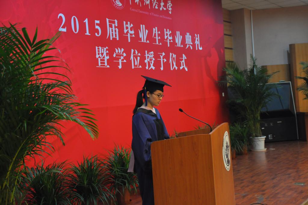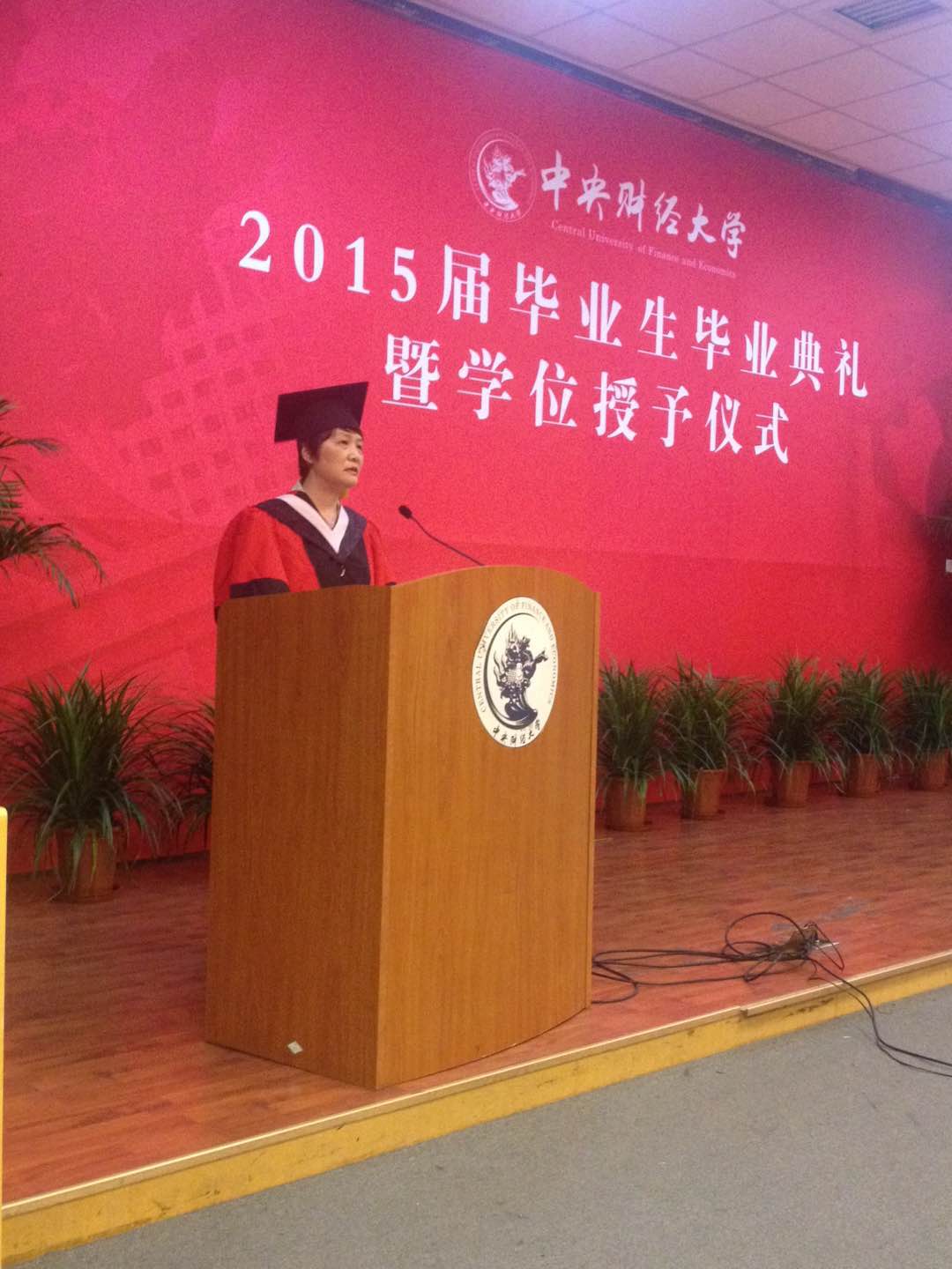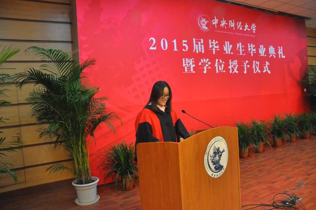 在庄严澎湃的国歌声中,典礼拉开了帷幕。陈灵副院长首先宣读了《关于2015届研究生毕业及授予学位的决定》,向今年获得硕士学位的7位同学表示祝贺。随后,陈老师宣读了《关于表彰2015届优秀毕业研究生的决定》,对获得校级优秀毕业生称号的贾宇清同学表示祝贺,并勉励其他同学以其为榜样,不断进取,教师代表韩世君老师为贾宇清同学颁发了荣誉证书。