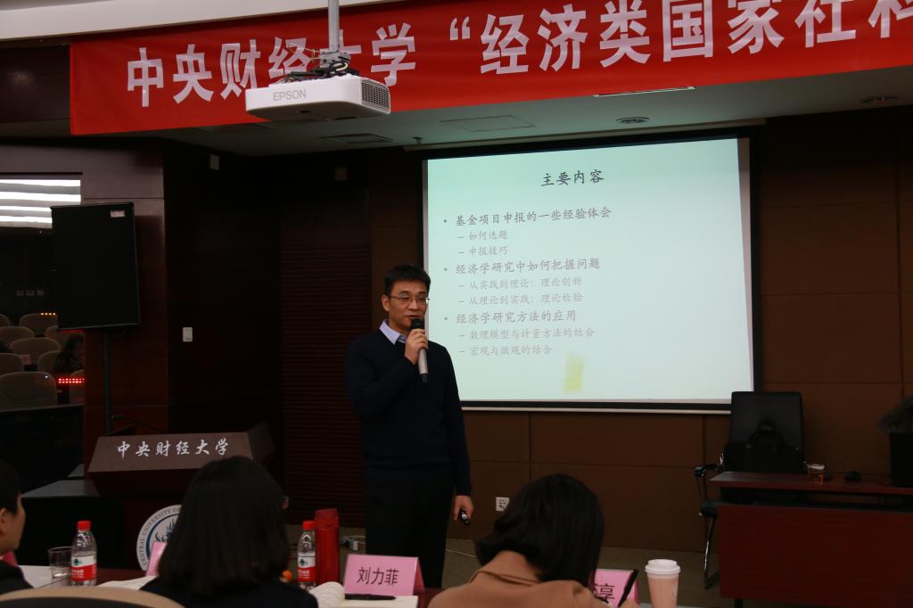 下午第二讲由中国人民大学财政金融学院院长助理贾俊雪教授主讲,课程内容包括基金项目申报、经济学研究中的问题把握与方法应用。
