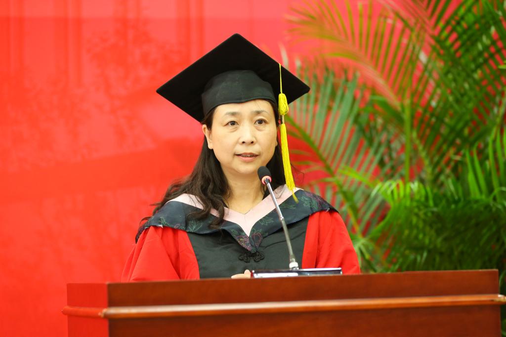 童伟研究员作为导师代表发言。童老师用她温柔的声音、优美的语言和深情的祝福打动着在场的毕业生和老师,对2017届所有毕业生表达了自己真挚的祝福和美好的期许,希望毕业生们在踏入社会后能够懂得感恩与珍惜。童老师希望毕业生们在以后的日子里,除了依然心存感激,还要用点滴的行动去感恩他人,回馈社会,能够把握生命之舟,珍惜每一天,过好每一天,保持健康的体魄和良好的生活方式,善待自己的生命,让生活变得更加精彩。最后,童老师祝愿毕业生们前程似锦、锦上添花、花中有梦、梦想成真!