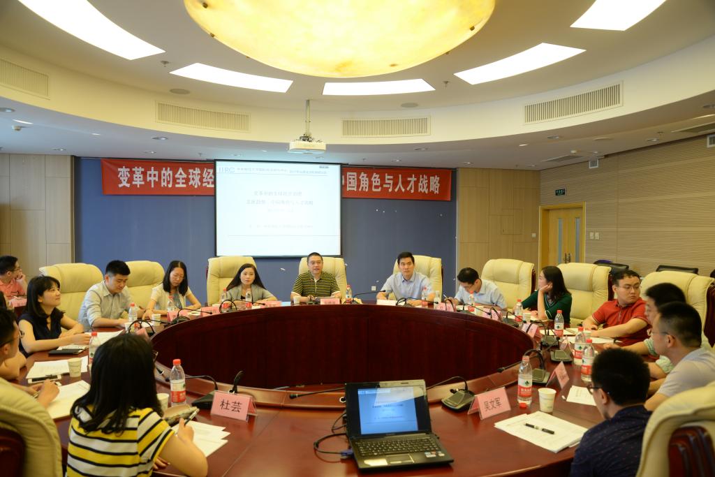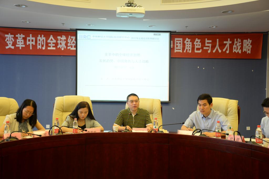 7月1日上午,由中央财经大学国际投资研究中心举办的“变革中的全球经济治理:发展趋势、中国角色与人才战略”研讨会在我校学术会堂606会议室举行。来自中国社会科学院工业经济研究所、中国五矿经济研究院、中国建设银行总行公司业务部、中国进出口银行总行战略规划部、中国工商银行私人银行部、中国原子能工业有限公司、中国银行总行及北京分行、财政部国际经济关系司、中国证券登记结算有限责任公司北京分公司、申万宏源证券固定收益融资总部、招商银行北京分行公司金融事业部、中国贸促会研究院国际投资研究部、中国机电产品进出口商会综合部、中国图书进出口(集团)总公司、国家开发银行总行等多位实务界和学术界的专家、学者以及本校师生近30人参与了本次会议。