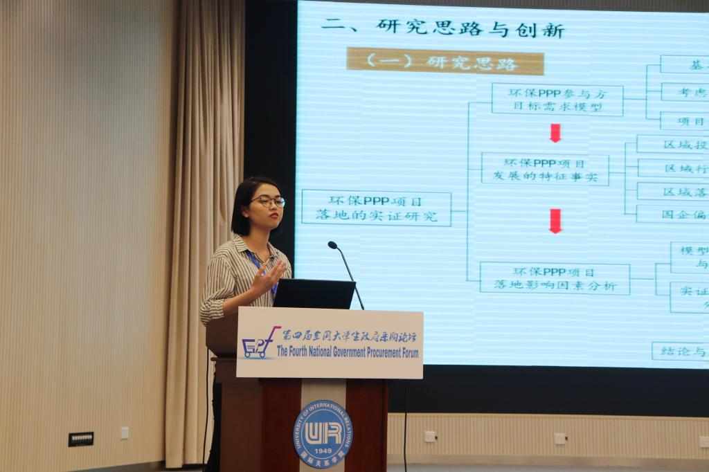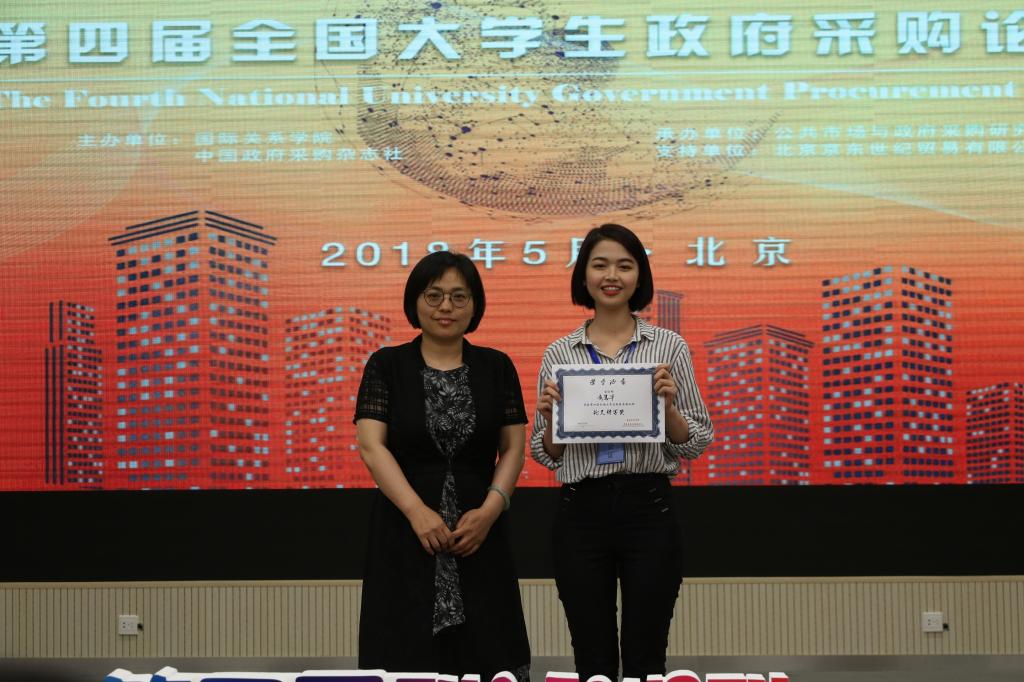 2018年5月27日,第四届全国大学生政府采购论坛在国际关系学院顺利举办。我院国际投资研究中心研究助理黄慧华(17级区域经济学硕士)受邀参加论坛并发表学术演讲,其撰写的论文《中国环保PPP项目落地影响的实证研究——基于参与方目标需求模型视角》最终荣获特等奖。