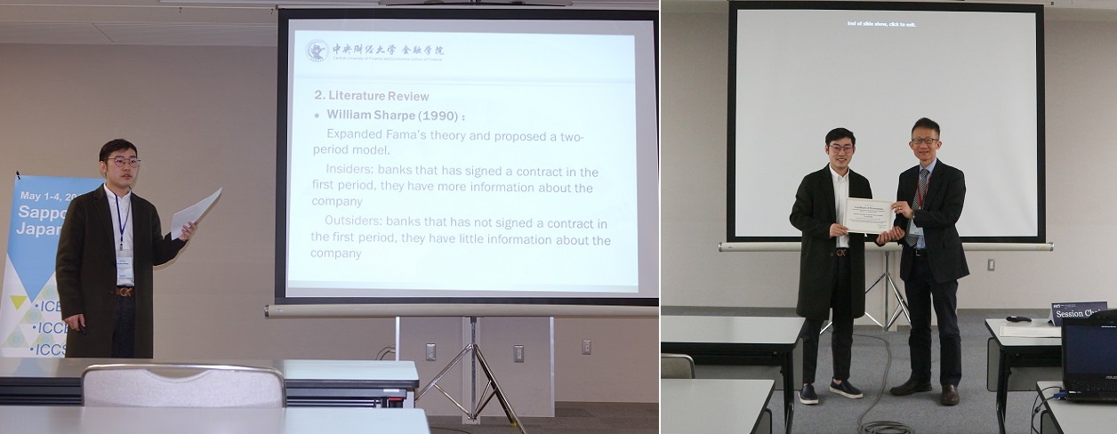 2016级金融学院研究生王亚楠同学对其题为:《Loan interest rate and concealment contracts with asymmetric information-from credit ceiling angle of commercial banks》的论文做了宣讲。论文主要采用混合策略的贝叶斯纳什均衡博弈论的研究方法,在威廉夏普1990年提出的关系型银行贷款模型基础上,探究商业银行贷款规模对企业贷款利率的定价问题。论文通过引入商业银行贷款额度限制的假设,重新分析不同类型商业银行在多期均衡中的贷款利率定价策略。通过模型分析和实证检验,得到了在市场中有较高贷款需求和较低不良贷款率时,大型商业银行将采取降低贷款利率定价竞争贷款资源策略的结论。论文宣讲结束后的讨论环节,王亚楠同学对各位学者提出的问题进行了解答。会议主席新加坡管理大学教授David Ding对论文进行了点评,并提出了宝贵意见:如银行类型的区分可以增加中型银行以及信息结构模型可以进一步完善等等。最后,David Ding教授向王亚楠同学颁发了会议论文宣讲证书。