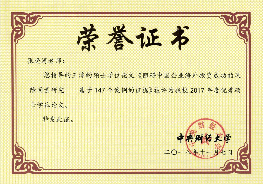 根据学校日前评选结果,张晓涛教授指导的王淳(2015级国际商务硕士)硕士学位论文《阻碍中国企业海外投资成功的风险因素研究——基于147个案例的证据》被评为我校2017年度优秀硕士学位论文,这篇论文是张晓涛教授团队关于“一带一路”建设与合作领域系列成果之一,自2014年以来张晓涛教授指导的硕士连续4年获得校级优秀学位论文(其中有两年两位硕士获得)。