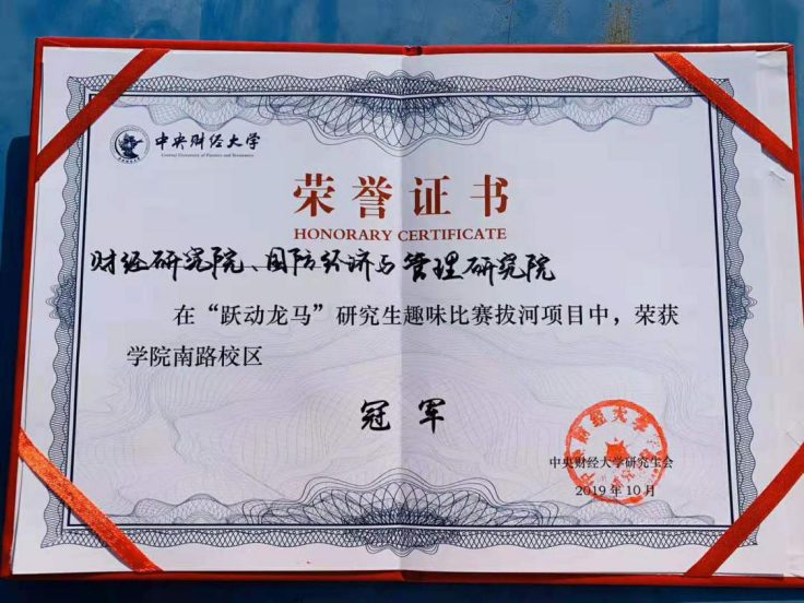 10月30日下午“跃动青春,龙马奔腾”研究生趣味比赛在我校学院南路校区如期举行,我院2018级研究生蒋培栋、王建业,2019级研究生丁一、苏鹏、马雪瑶、樊美玲、刘明光、何涌等13名同学与国防经济与管理研究院联队参加了此次趣味运动会。在本次比赛中,同学们奋力拼搏、团结合作,最终不负众望,成功卫冕拔河比赛第一名,同时长绳比赛也取得了第四名的优异成绩,体现了我院学子“忠诚、团结、求实、创新”的理想信念和精神追求。