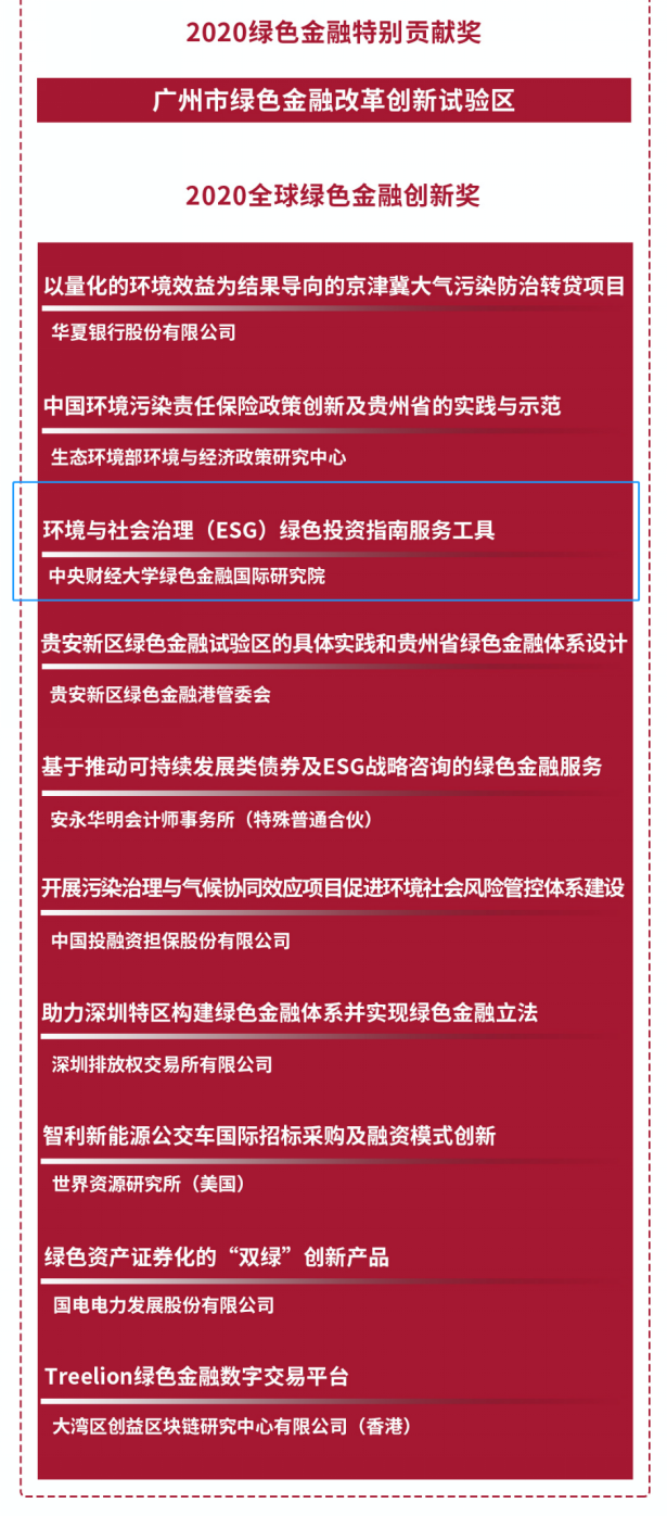 11月15日,国际金融论坛(IFF)正式公布了“2020全球绿色金融创新奖”获奖名单。我院研究员王遥牵头研究并提报的“环境与社会治理(ESG)绿色投资指南服务工具”经由15位权威评审组成的评审委员会依据项目创新性、可推广性、行业贡献度、盈利性和促进公共福祉五个维度进行综合评议后,荣获“2020全球绿色金融创新奖”。
