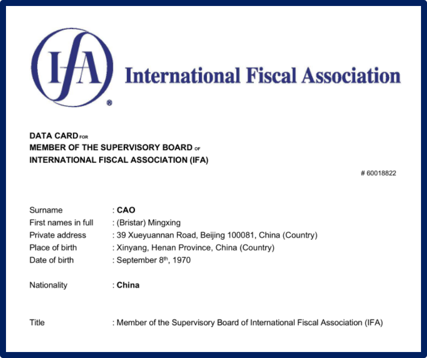International Fiscal Association (IFA)国际财税协会是全球最有代表性和影响力的国际税收专业组织,目前有160多个国家/地区会员,立足于搭建政府、学界和市场的国际税收交流平台和专业共同体。中国国家税务总局较早参与了IFA的活动;为了更好地推进IFA在中国的发展,促进中国国际税收事业的进步,2013年经总会与中国国家税务总局协调,正式组建IFA中国分会,国家税务总局原副局长张志勇担任总顾问,秘书处设在中央财经大学国际税务研究中心,李俊生教授担任主席,曹明星教授担任秘书长;2017年IFA巴西年会推举曹明星担任总会执行委员会中国执行委员,2018年IFA韩国年会推举中国财税法学研究会常务副会长熊伟教授担任总会学术委员会中国委员。国际财税协会总会和中国分会一直致力于推进中国及区域内的国际税收学术研究、会员交流和社会服务工作。