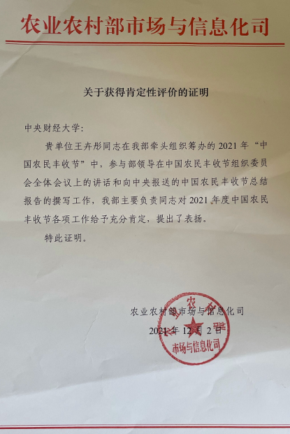 12月2日,在农业农村部牵头组织筹办的2021年“中国农民丰收节”中,我院王卉彤研究员参与的部领导讲话以及向中央报送的总结报告,获得了该部主要负责同志的充分肯定和表扬。