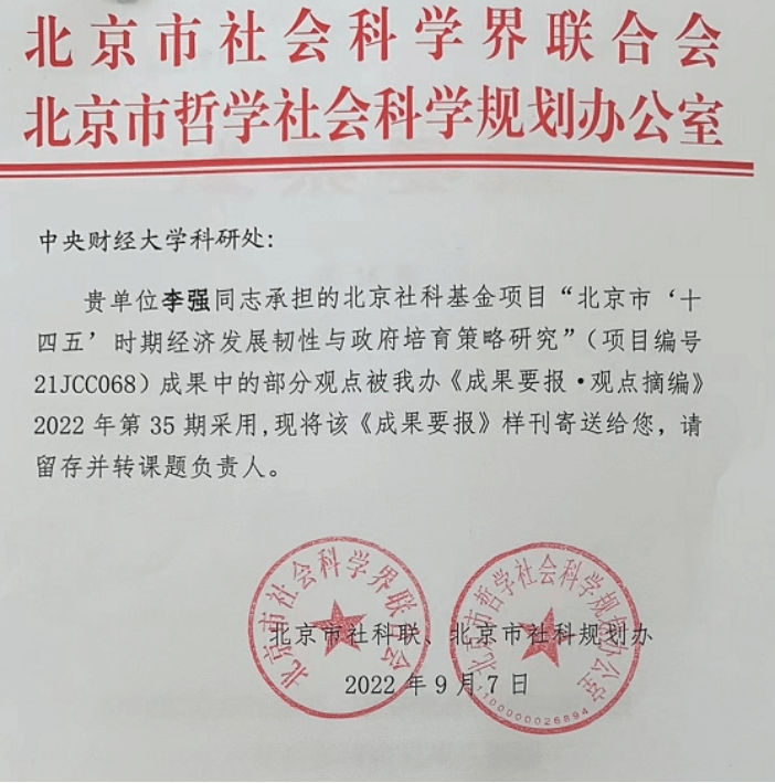 9月7日,我院李强老师承担的北京社科基金项目“北京市‘十四五’时期经济发展韧性与政府培育策略研究”的阶段性成果中的部分观点被《成果要报·观点摘编》2022年第35期所采用。