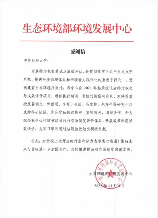 近日,生态环境部环境发展中心向我校发来感谢信,对我校城市与区域可持续发展研究中心主任刘倩副研究员团队积极参与《省级排污权交易影响分析及信息可视化研究》课题研究相关工作表示感谢,信中特别肯定了我中心科研团队的专业能力与探索精神。