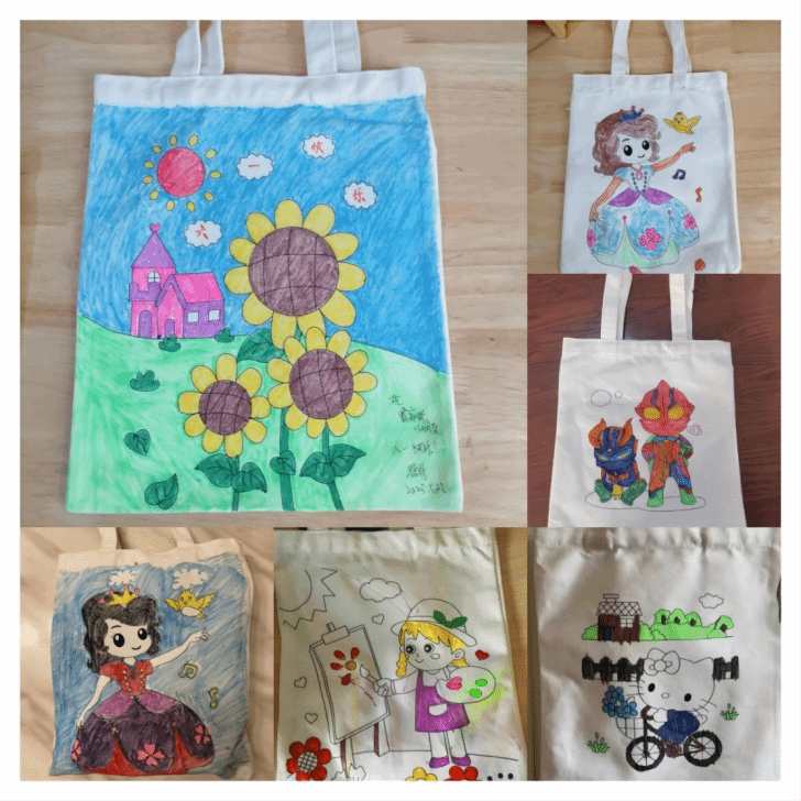 院里为孩子们准备了糖果、彩笔、布袋,孩子们一起吃糖、聊天、画画,好不开心。画画是孩子的天性,小朋友们一拿到画笔和布袋就迫不及待的开工了。红的、绿的、黄的、蓝的,一笔、一画、一点、一捺,每个小朋友都是那么认真那么投入,他们画的就是自己眼里的世界:五彩缤纷又天真可爱。